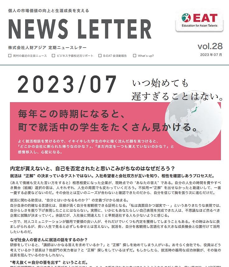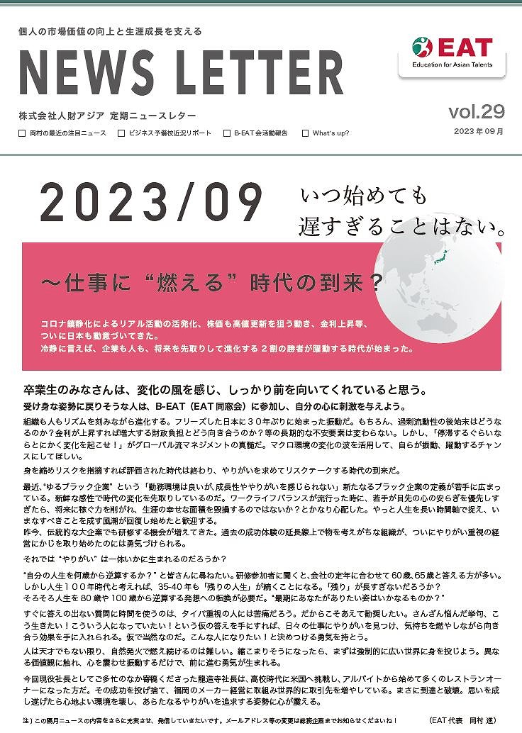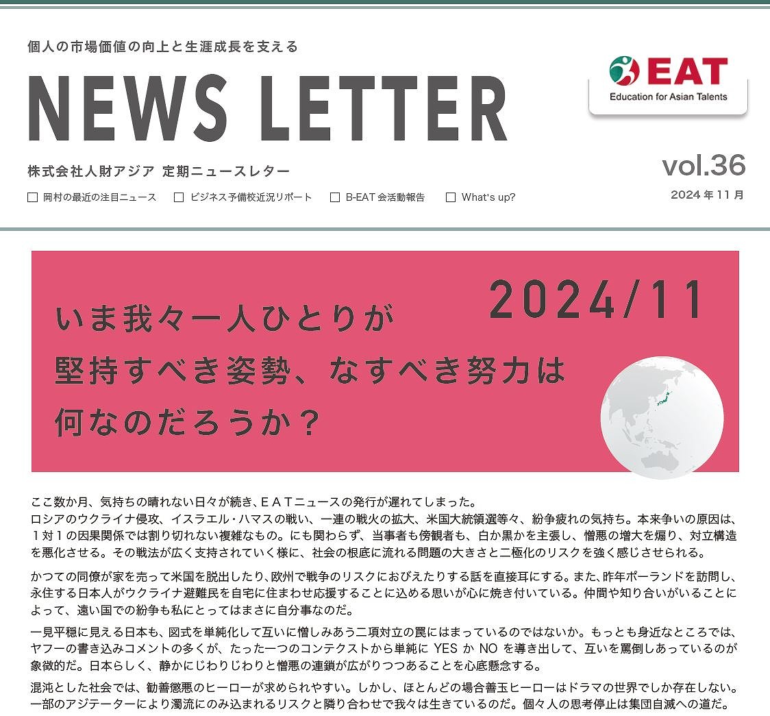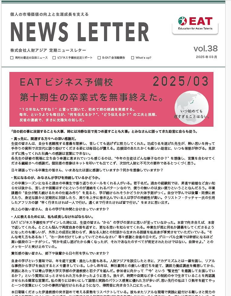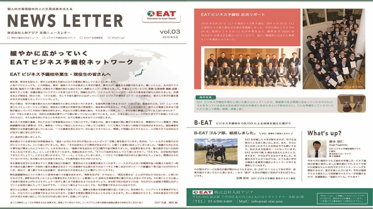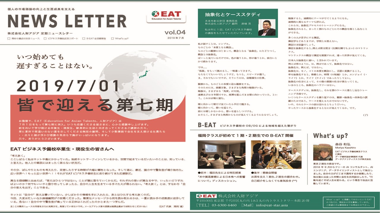 EAT NEWS Letter の掲載を始めます。 EATビジネス予備校生徒、ご講師、派遣元企業、日ごろ応援くださる皆様等に向けて隔月発信してまいりましたニュースレターにつき、今後アーカイブを本欄に掲載することにいたしました。 ご希望のかたにはメール発信も行い、双方向のコミュニケーションのネットワークにご参加いただけたら嬉しく思います。