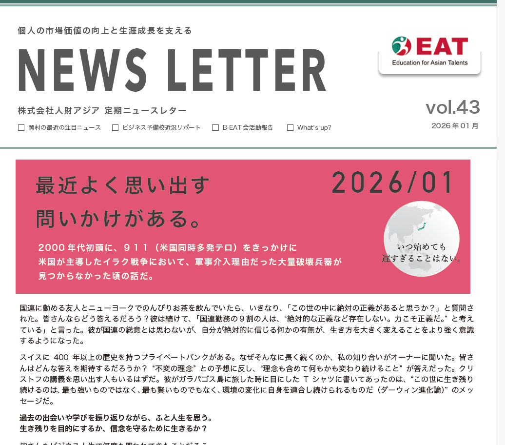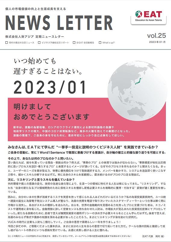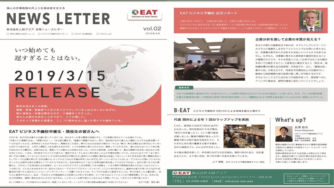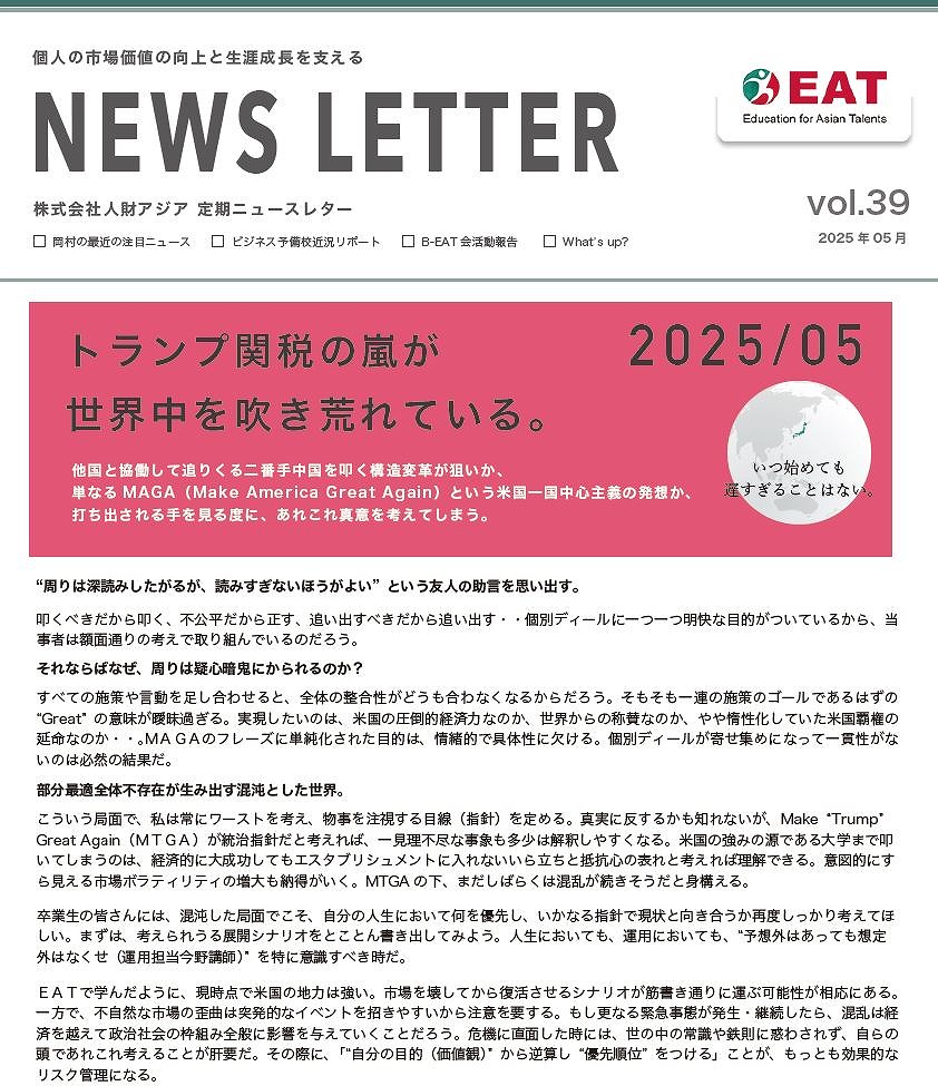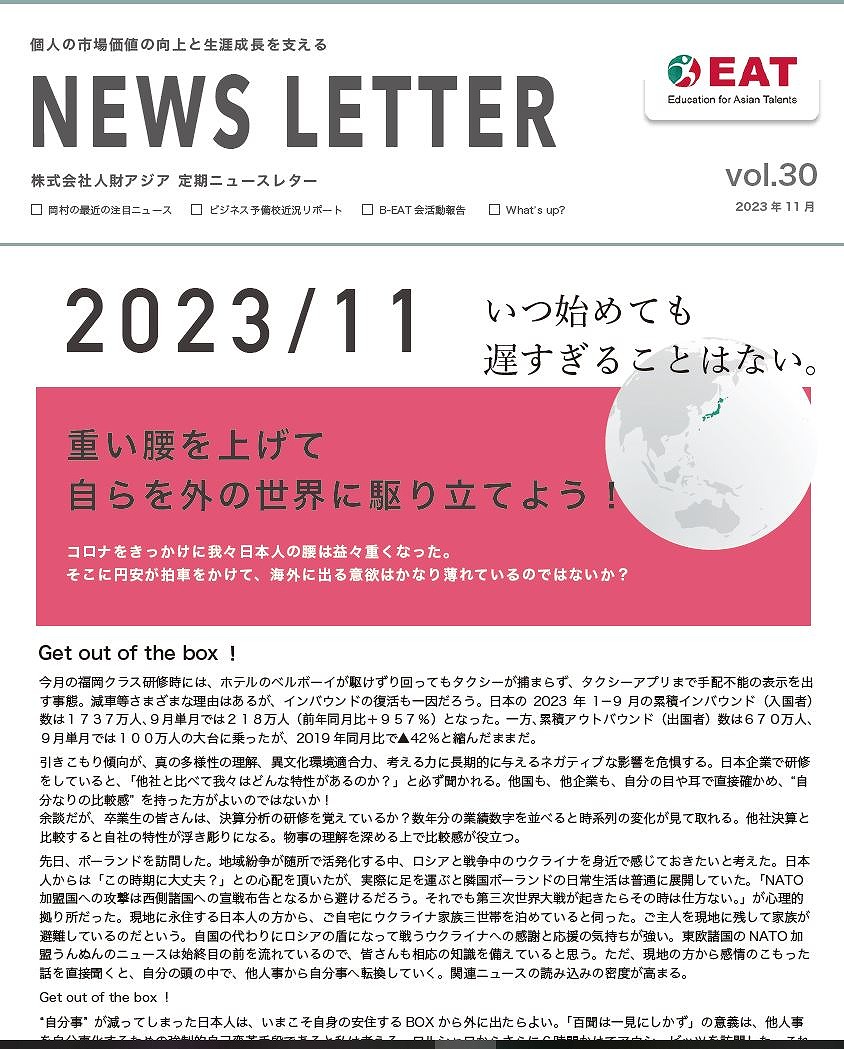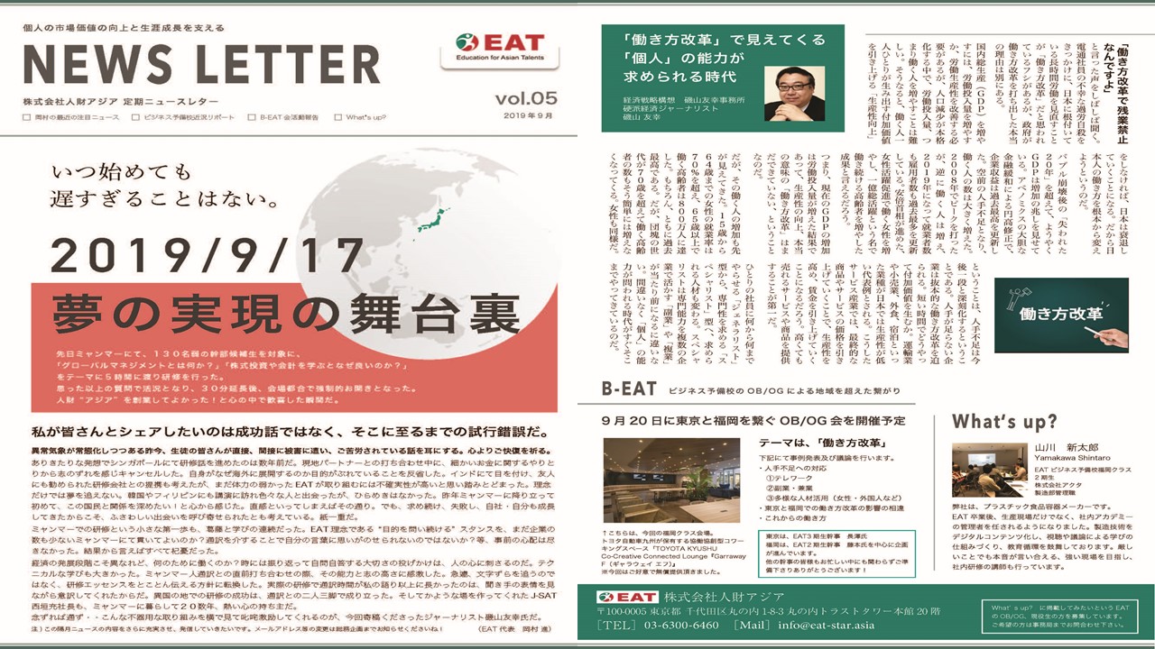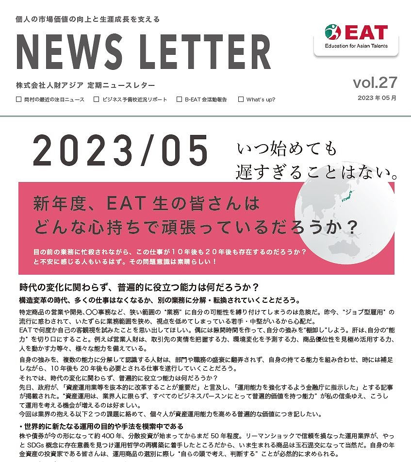 EAT NEWS Letter の掲載を始めます。 EATビジネス予備校生徒、ご講師、派遣元企業、日ごろ応援くださる皆様等に向けて隔月発信してまいりましたニュースレターにつき、今後アーカイブを本欄に掲載することにいたしました。 ご希望のかたにはメール発信も行い、双方向のコミュニケーションのネットワークにご参加いただけたら嬉しく思います。