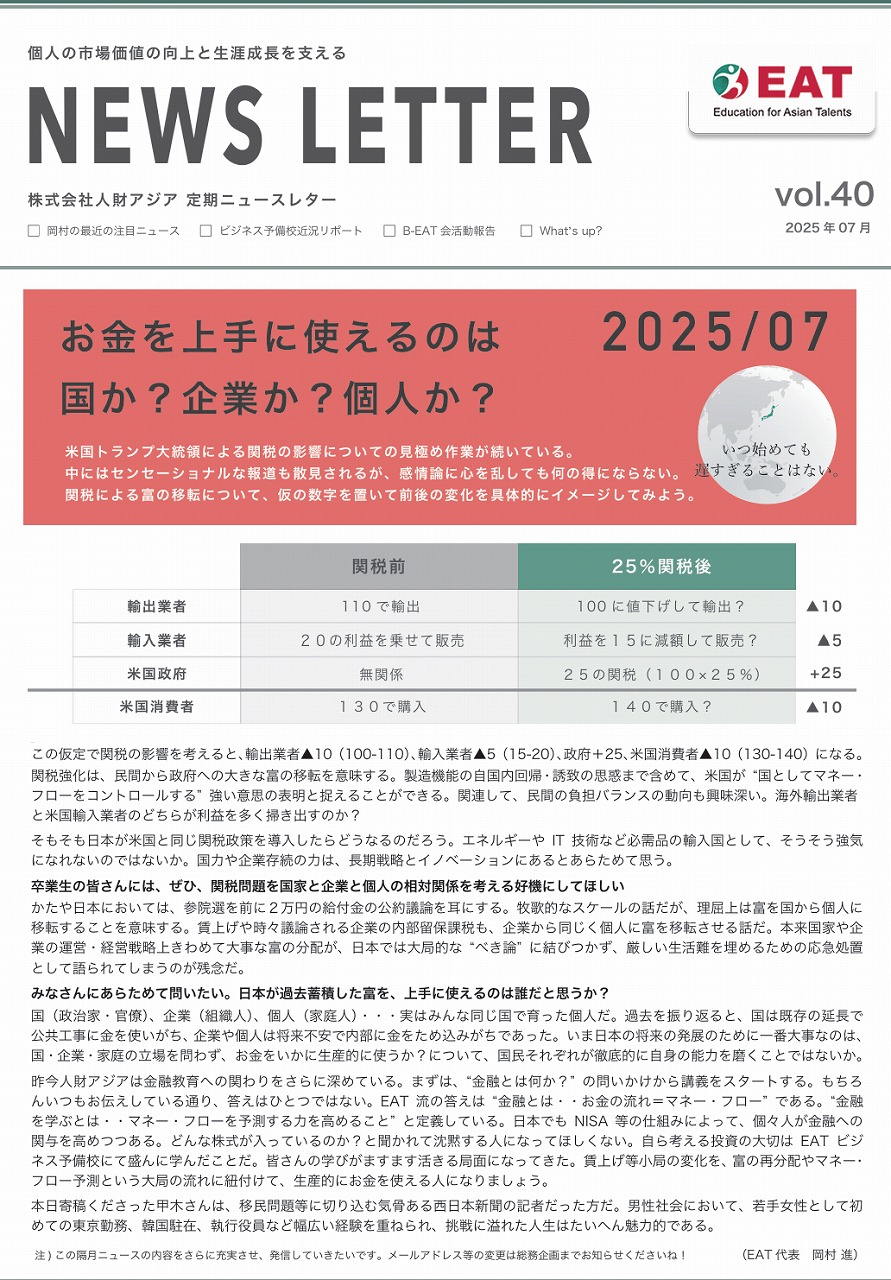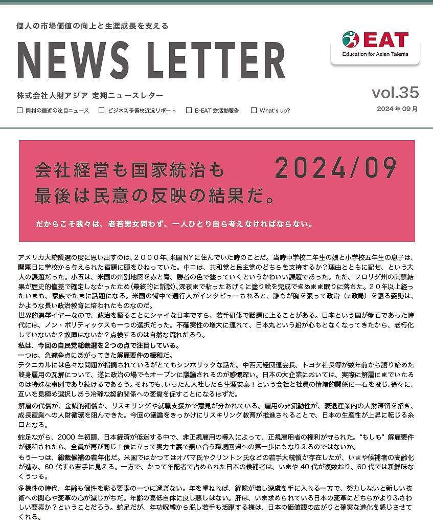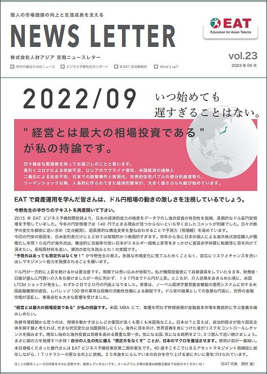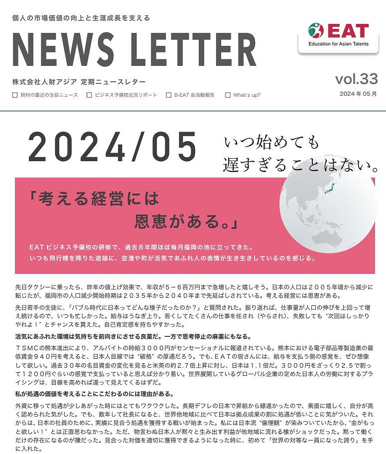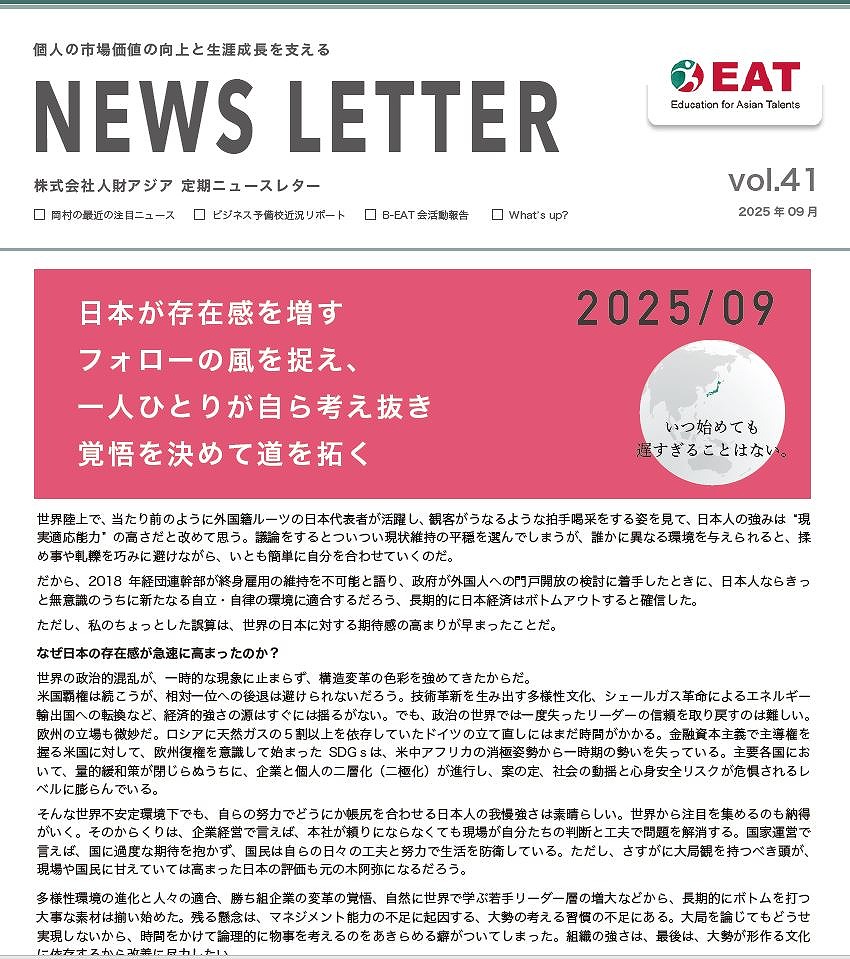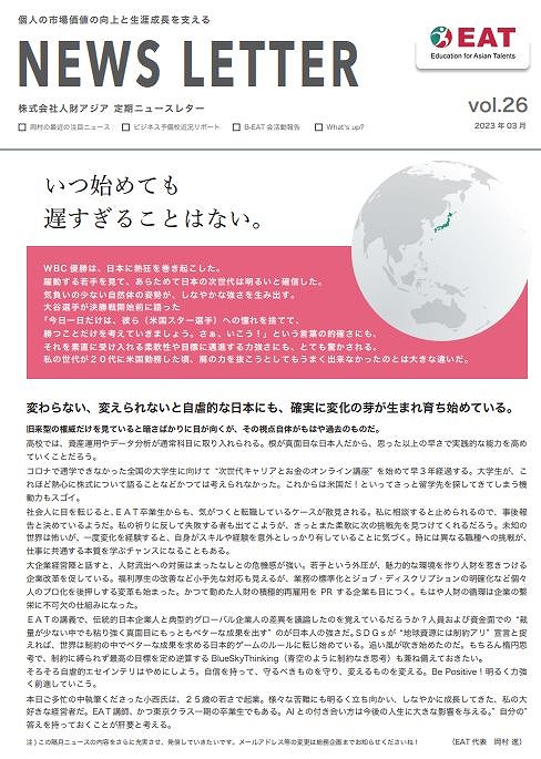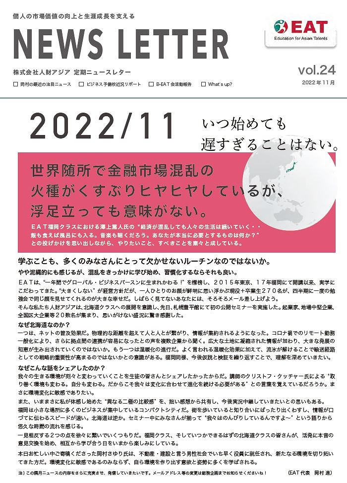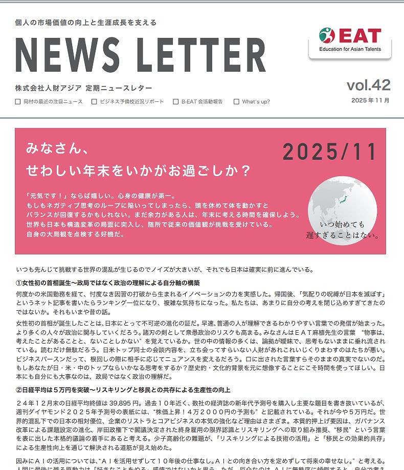 EAT NEWS Letter の掲載を始めます。 EATビジネス予備校生徒、ご講師、派遣元企業、日ごろ応援くださる皆様等に向けて隔月発信してまいりましたニュースレターにつき、今後アーカイブを本欄に掲載することにいたしました。 ご希望のかたにはメール発信も行い、双方向のコミュニケーションのネットワークにご参加いただけたら嬉しく思います。