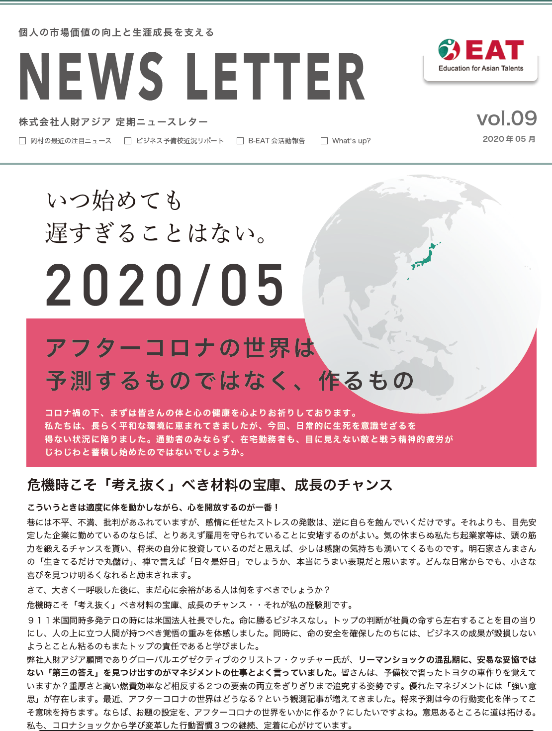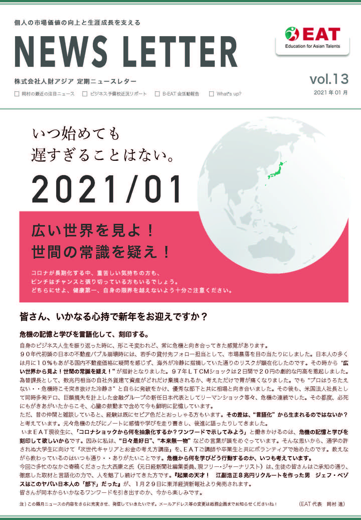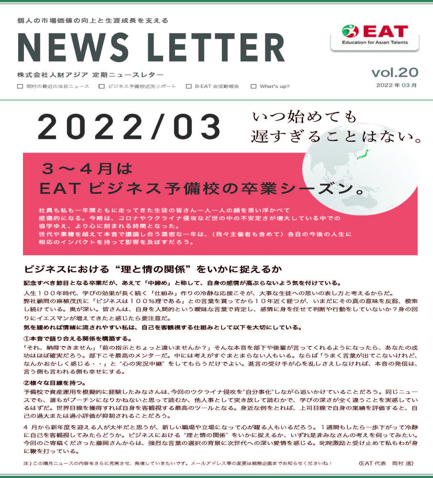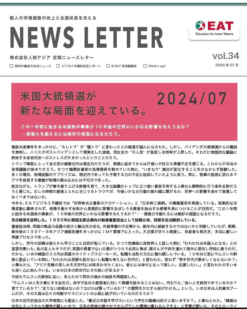 EAT NEWS Letter の掲載を始めます。 EATビジネス予備校生徒、ご講師、派遣元企業、日ごろ応援くださる皆様等に向けて隔月発信してまいりましたニュースレターにつき、今後アーカイブを本欄に掲載することにいたしました。 ご希望のかたにはメール発信も行い、双方向のコミュニケーションのネットワークにご参加いただけたら嬉しく思います。
