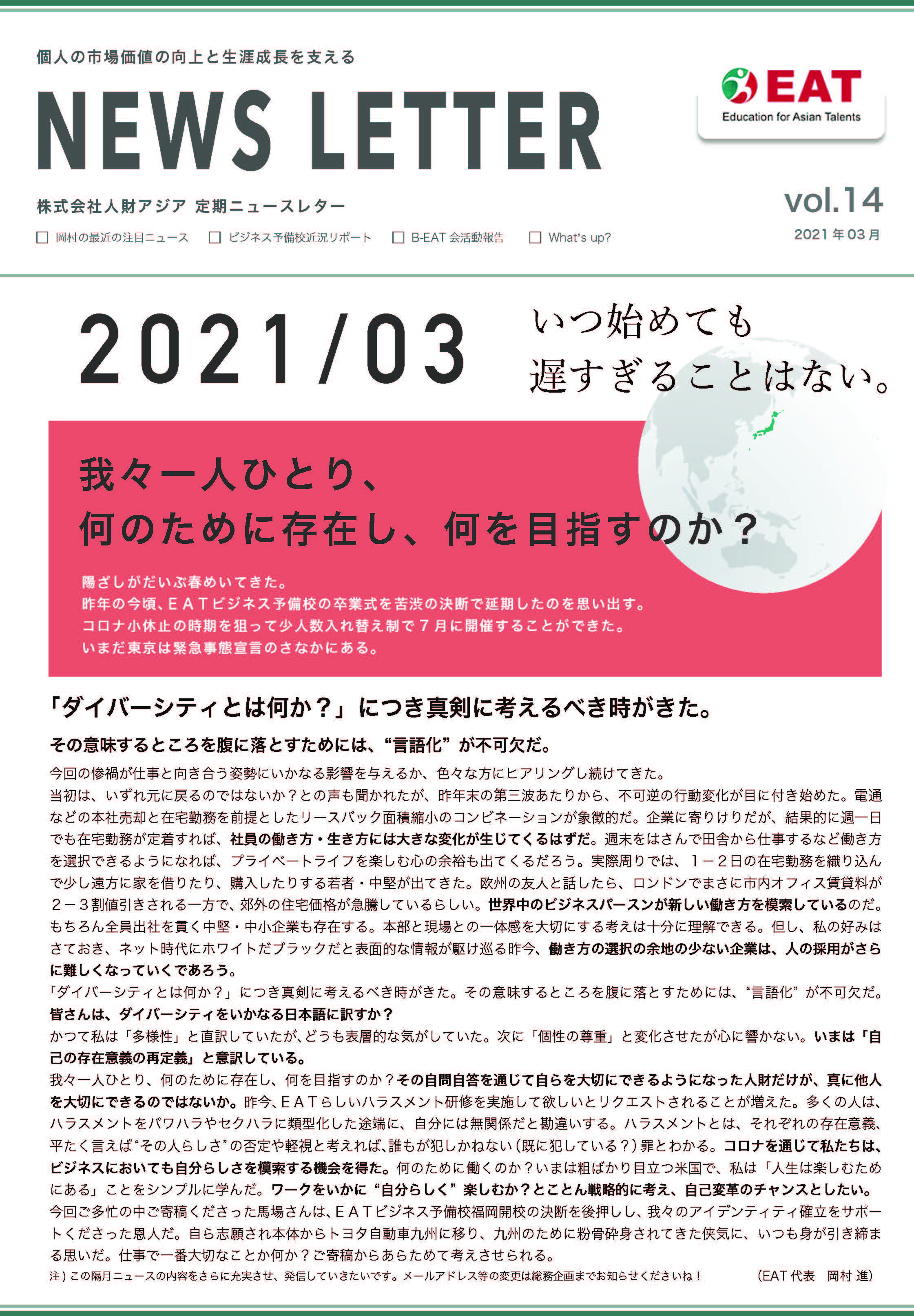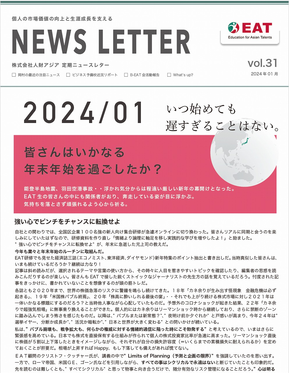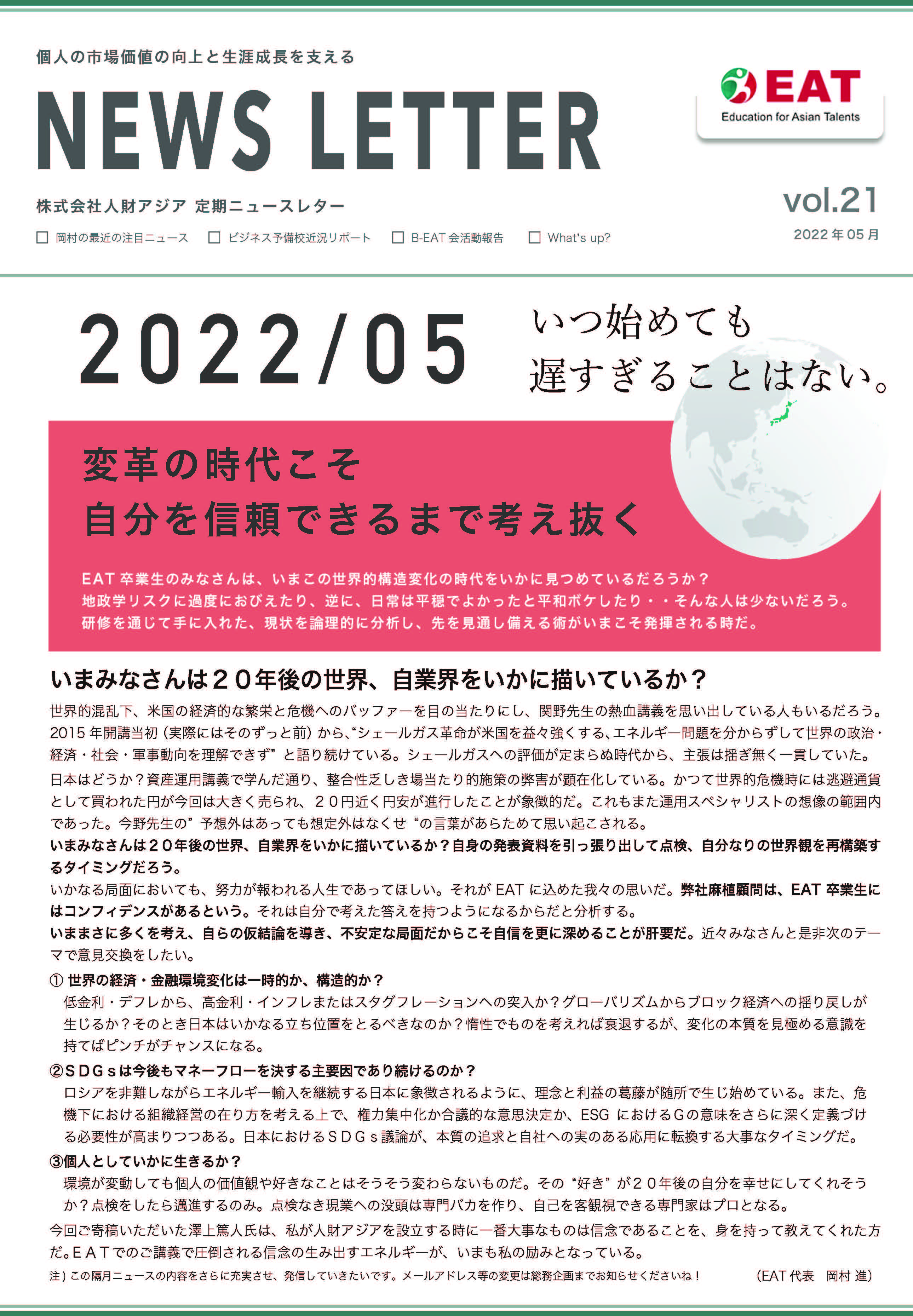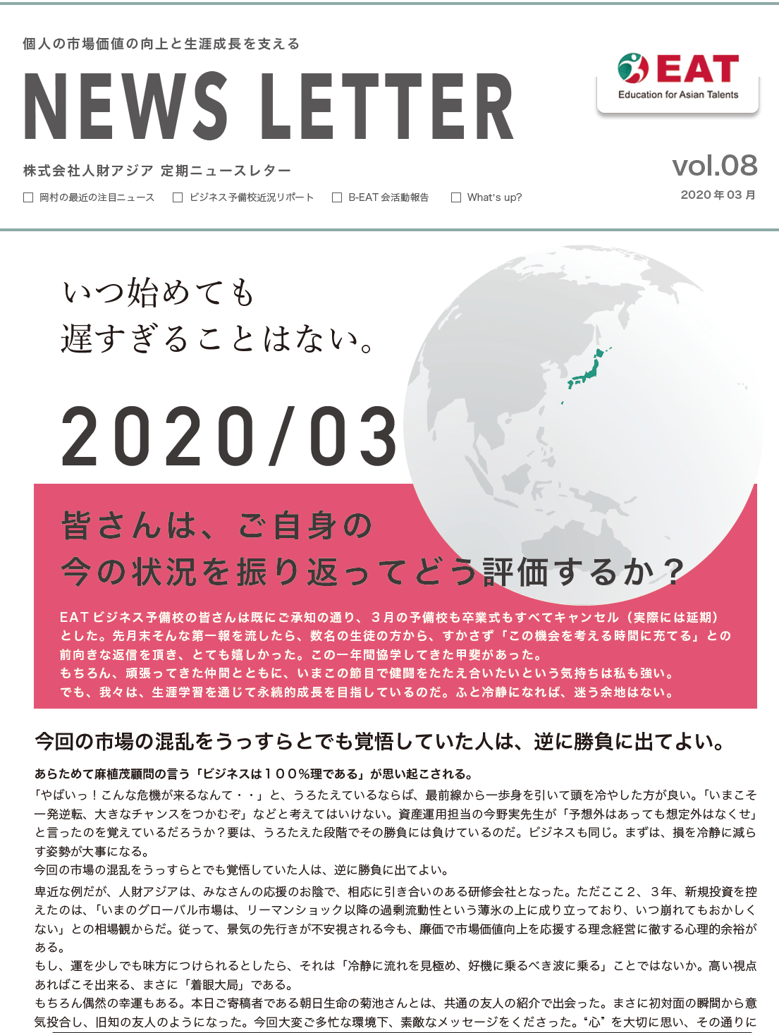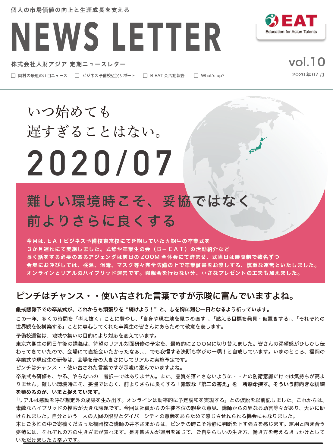 EAT NEWS Letter の掲載を始めます。 EATビジネス予備校生徒、ご講師、派遣元企業、日ごろ応援くださる皆様等に向けて隔月発信してまいりましたニュースレターにつき、今後アーカイブを本欄に掲載することにいたしました。 ご希望のかたにはメール発信も行い、双方向のコミュニケーションのネットワークにご参加いただけたら嬉しく思います。