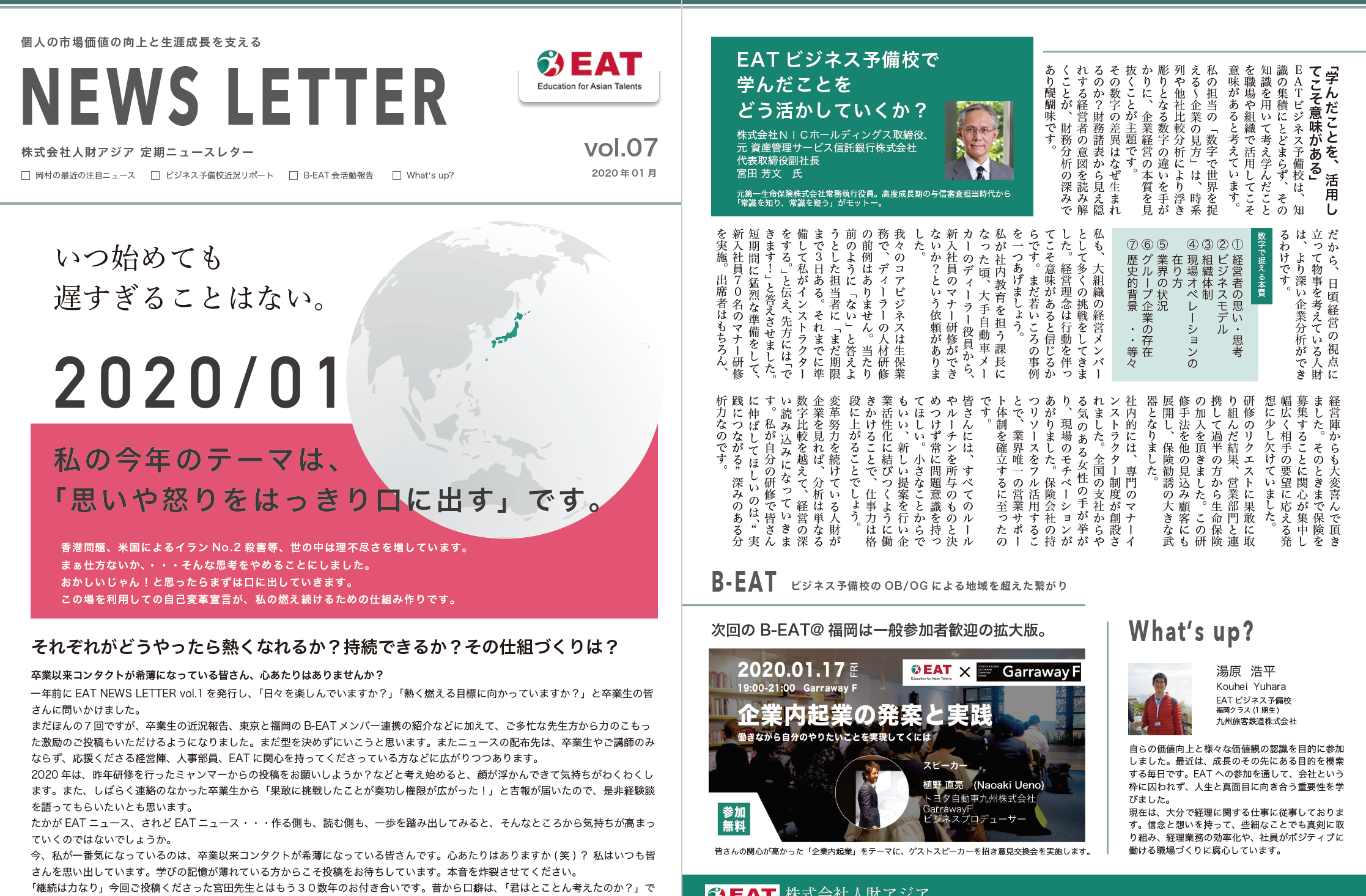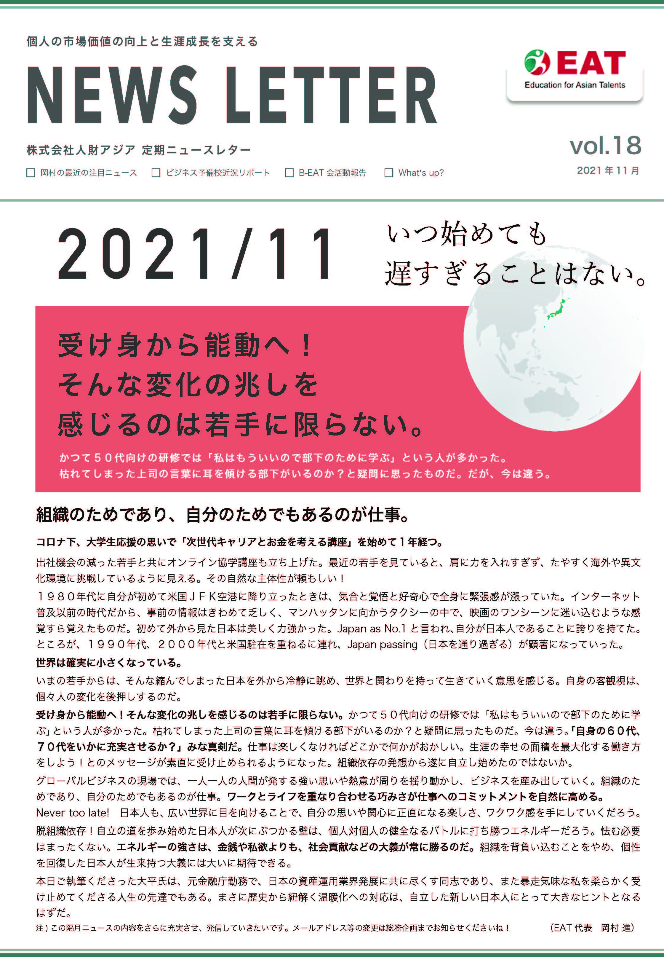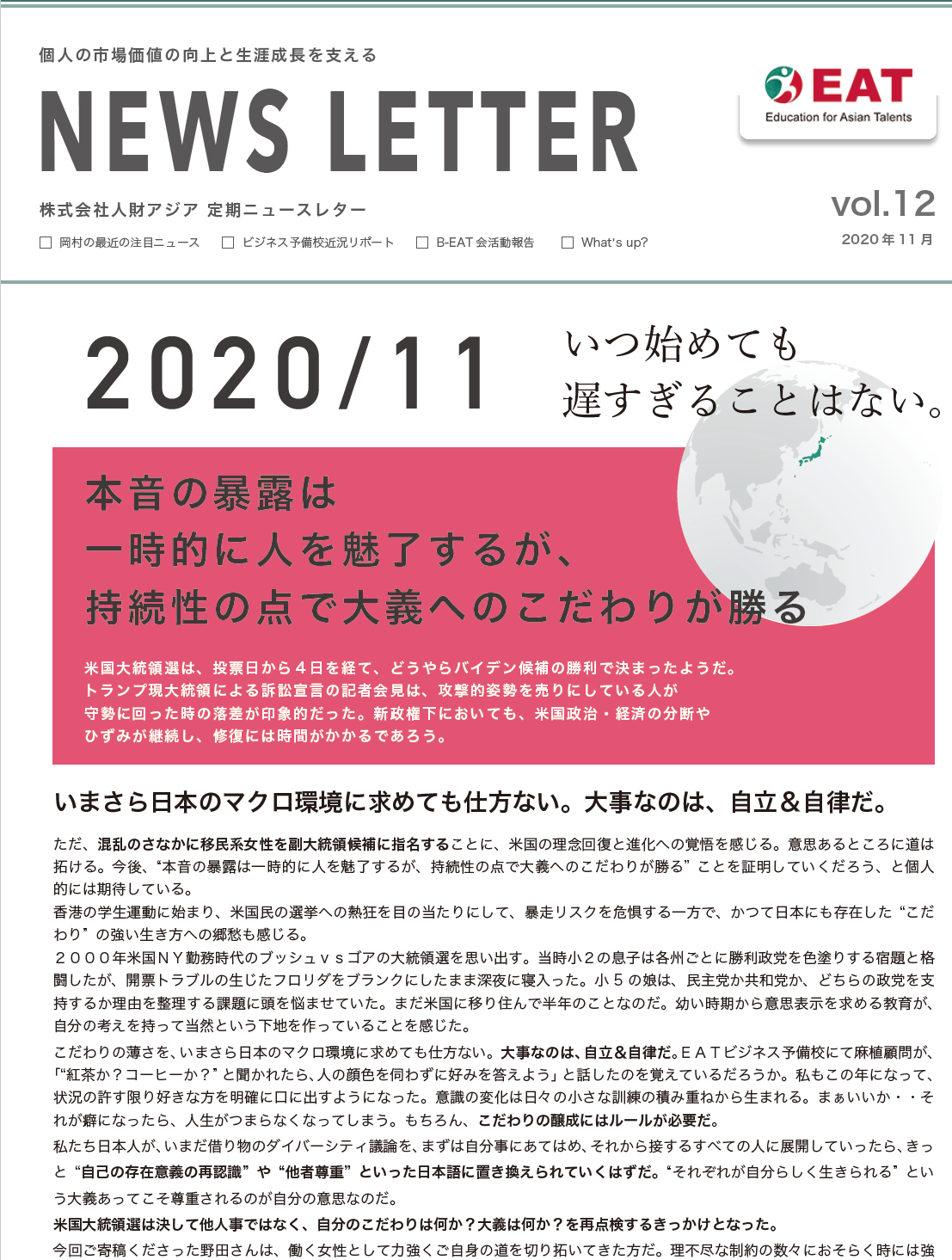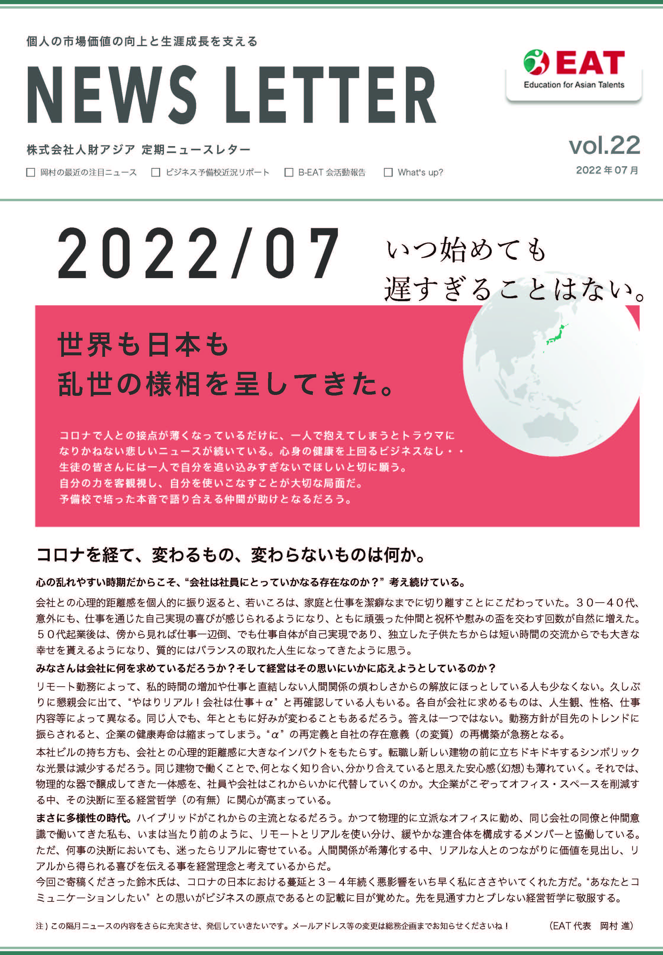 EAT NEWS Letter の掲載を始めます。 EATビジネス予備校生徒、ご講師、派遣元企業、日ごろ応援くださる皆様等に向けて隔月発信してまいりましたニュースレターにつき、今後アーカイブを本欄に掲載することにいたしました。 ご希望のかたにはメール発信も行い、双方向のコミュニケーションのネットワークにご参加いただけたら嬉しく思います。