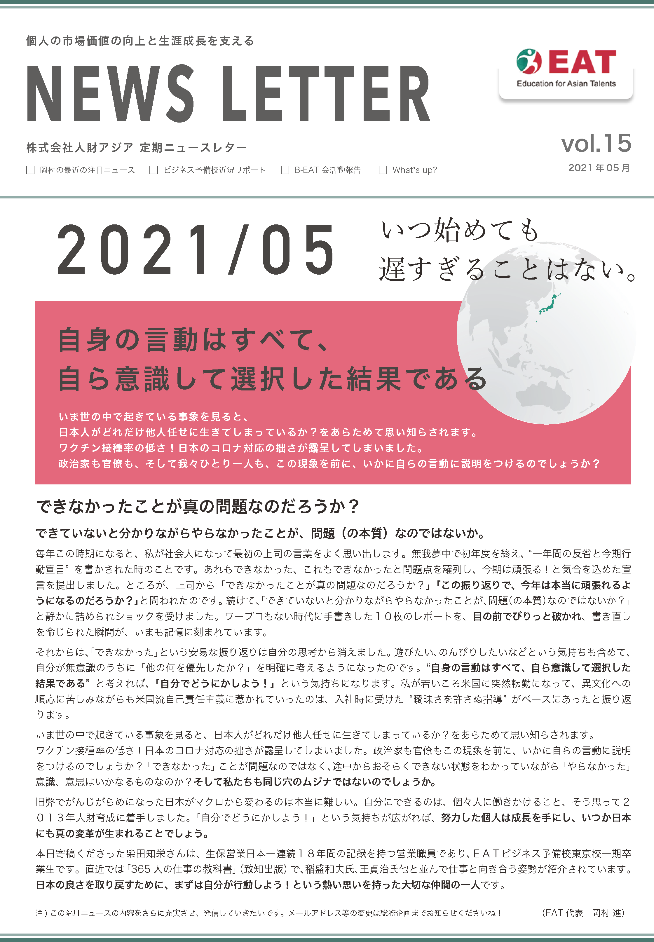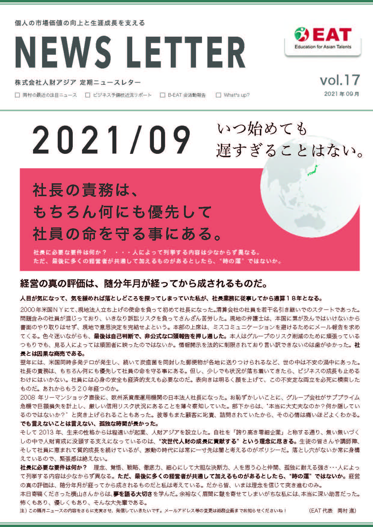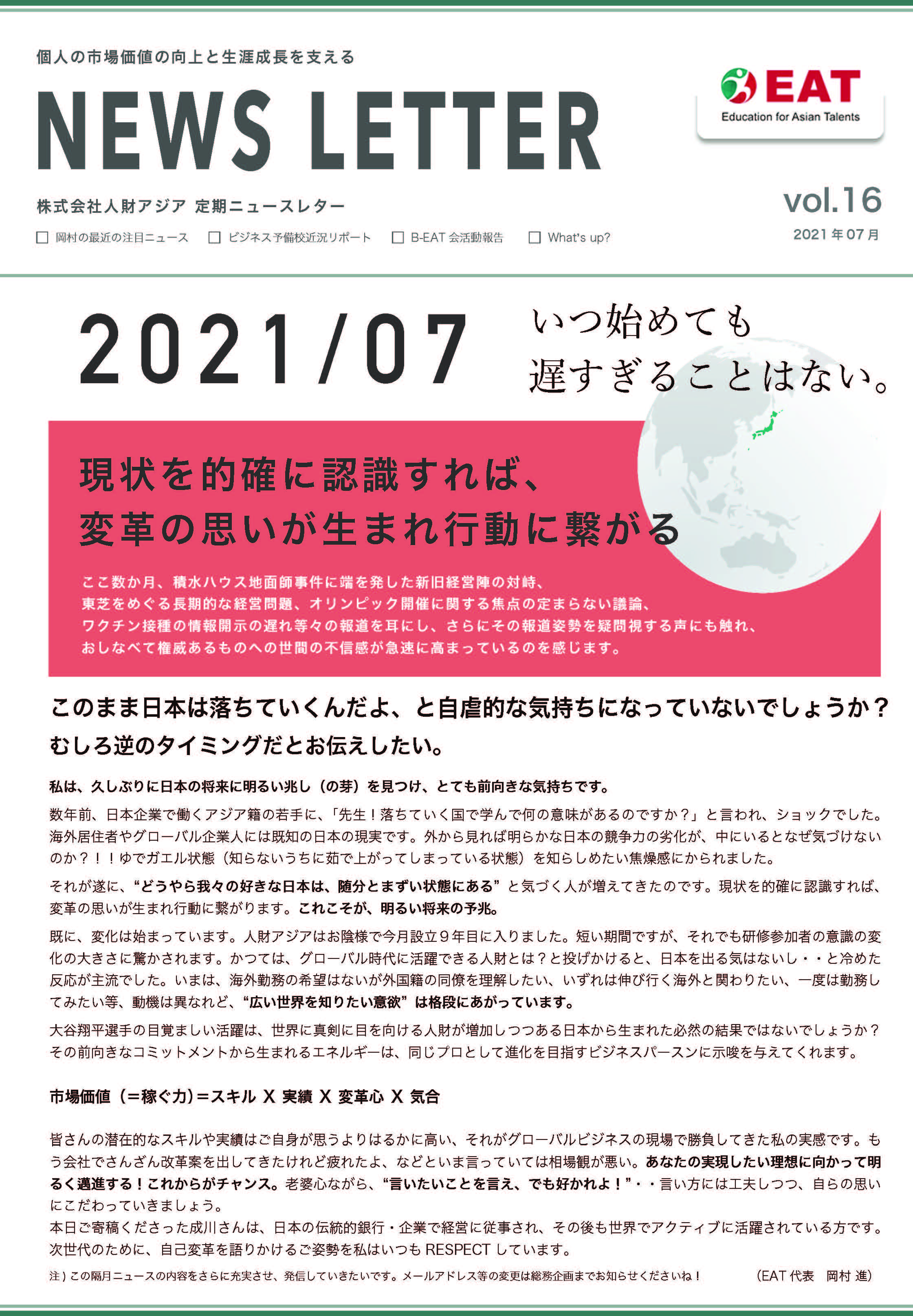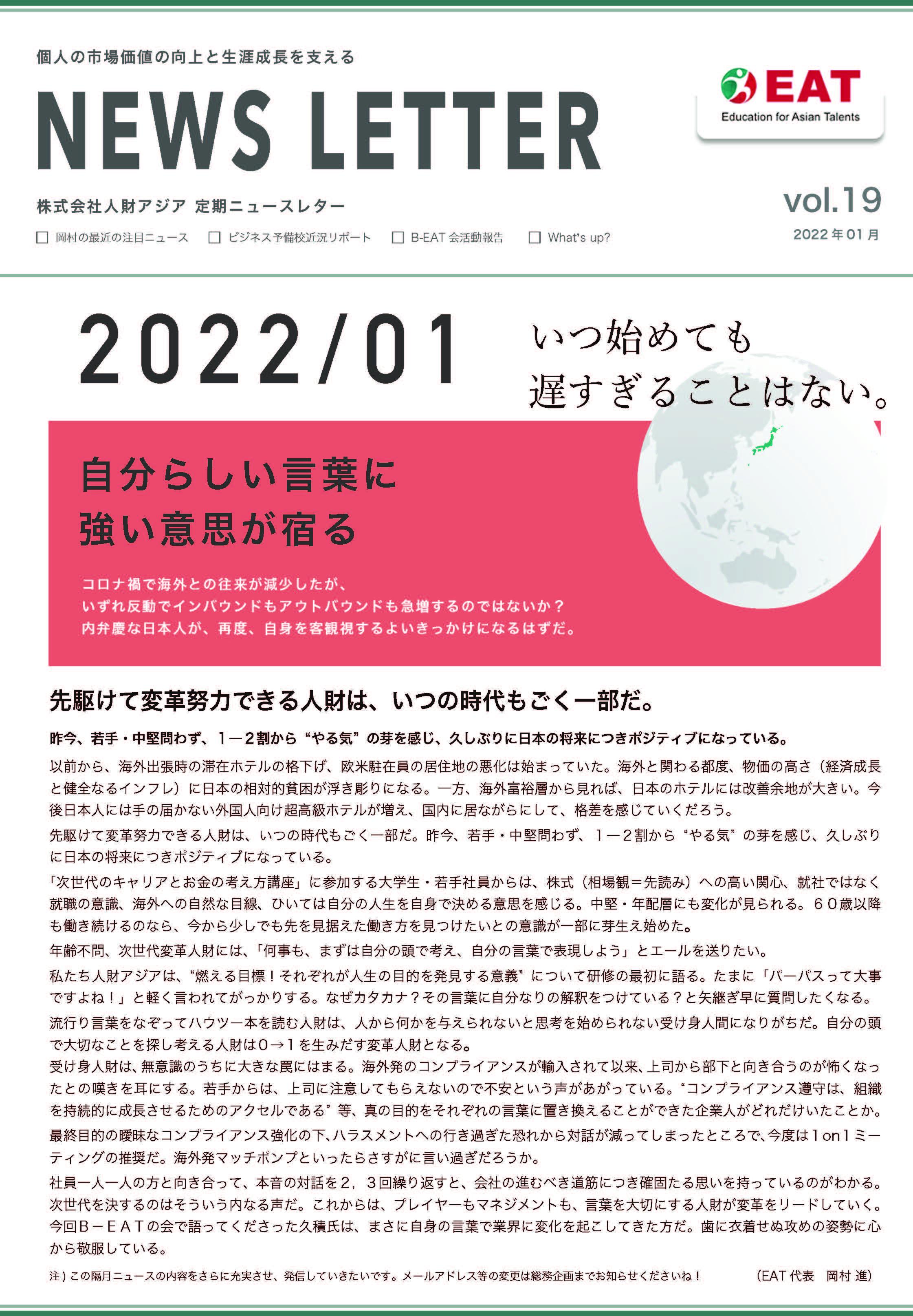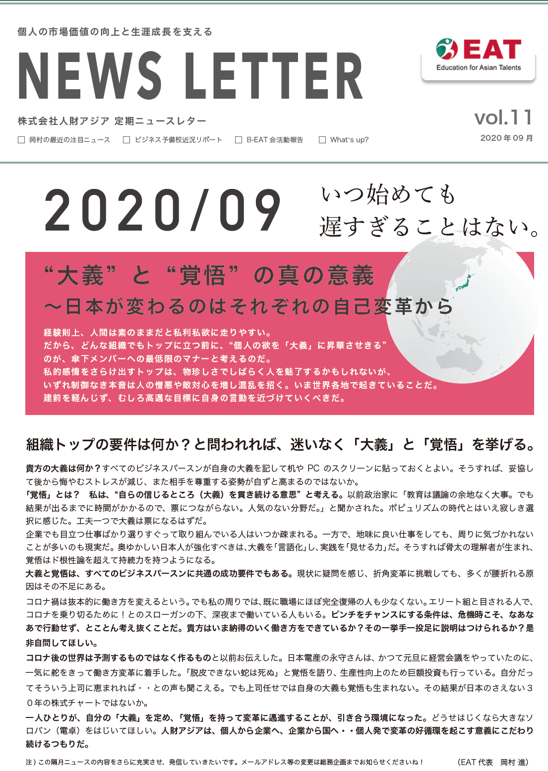 EAT NEWS Letter の掲載を始めます。 EATビジネス予備校生徒、ご講師、派遣元企業、日ごろ応援くださる皆様等に向けて隔月発信してまいりましたニュースレターにつき、今後アーカイブを本欄に掲載することにいたしました。 ご希望のかたにはメール発信も行い、双方向のコミュニケーションのネットワークにご参加いただけたら嬉しく思います。